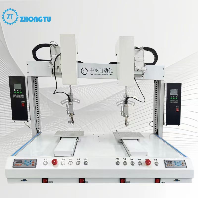 روبوت لحام أوتوماتيكي متقدم مصمم لتطبيقات اللحام الدقيقة في مصانع التصنيع وعمليات SMT و DIP. يتميز برؤوس لحام مزدوجة ومحور دوران لتعزيز المرونة والإنتاجية.